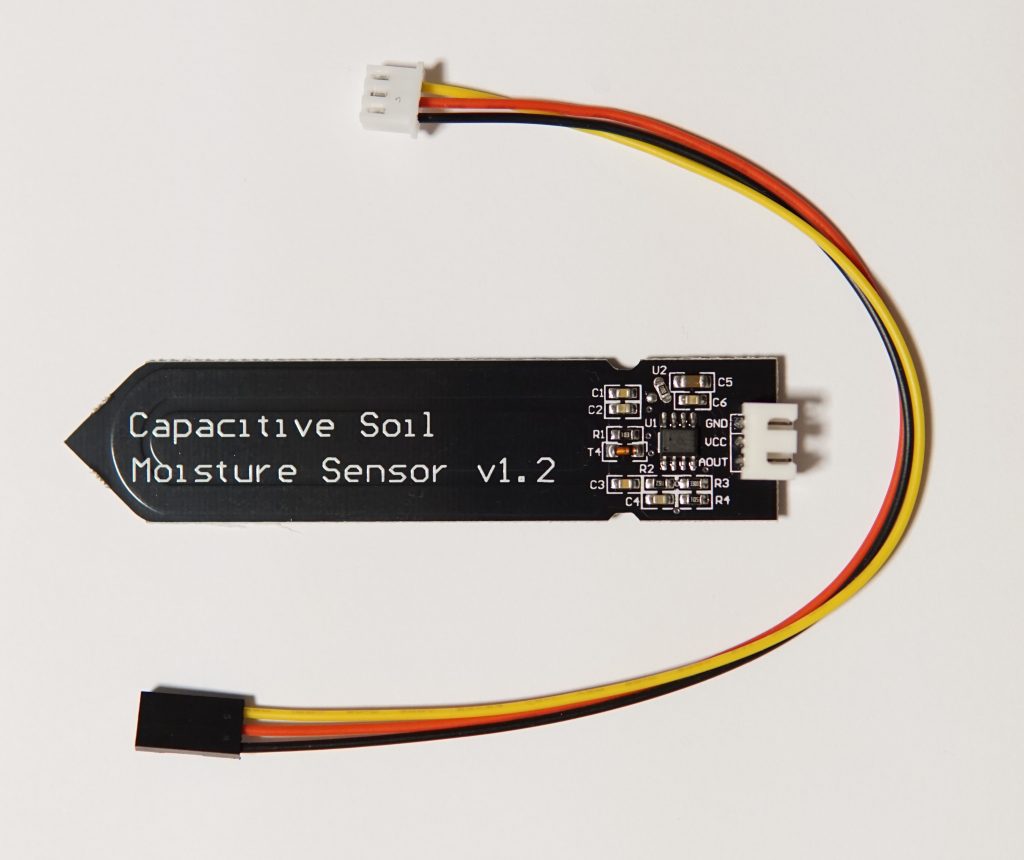 Wie dieser Sensor funktioniert, werde ich hier nur kurz anschneiden. Der Sensor wird mit 3.3V versorgt und gibt eine analoge Spannung aus. Diese Spannung ist indirekt proportional zur Feuchte in der Erde. Ist die Erde trocken (0%), liegt die Spannung bei 2.01 Volt. Ist die Erde komplett feucht (100%), liegt die Spannung bei 0.76 Volt. Simuliert wird dies, indem ich den Sensor in ein Glas Wasser halte (natürlich nicht die elektronischen Komponenten). Dazwischen wird linear interpoliert, da ich keine weitere Messpunkte darstellen kann.