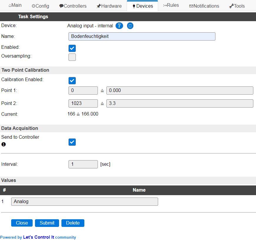Der interne ADC wird über ESP Easy mit dem Device Analog input – internal ausgelesen. Mithilfe einer Zwei-Punkt Kalibrierung wird jedem Bit-Wert der passende Spannungswert zugeordnet.